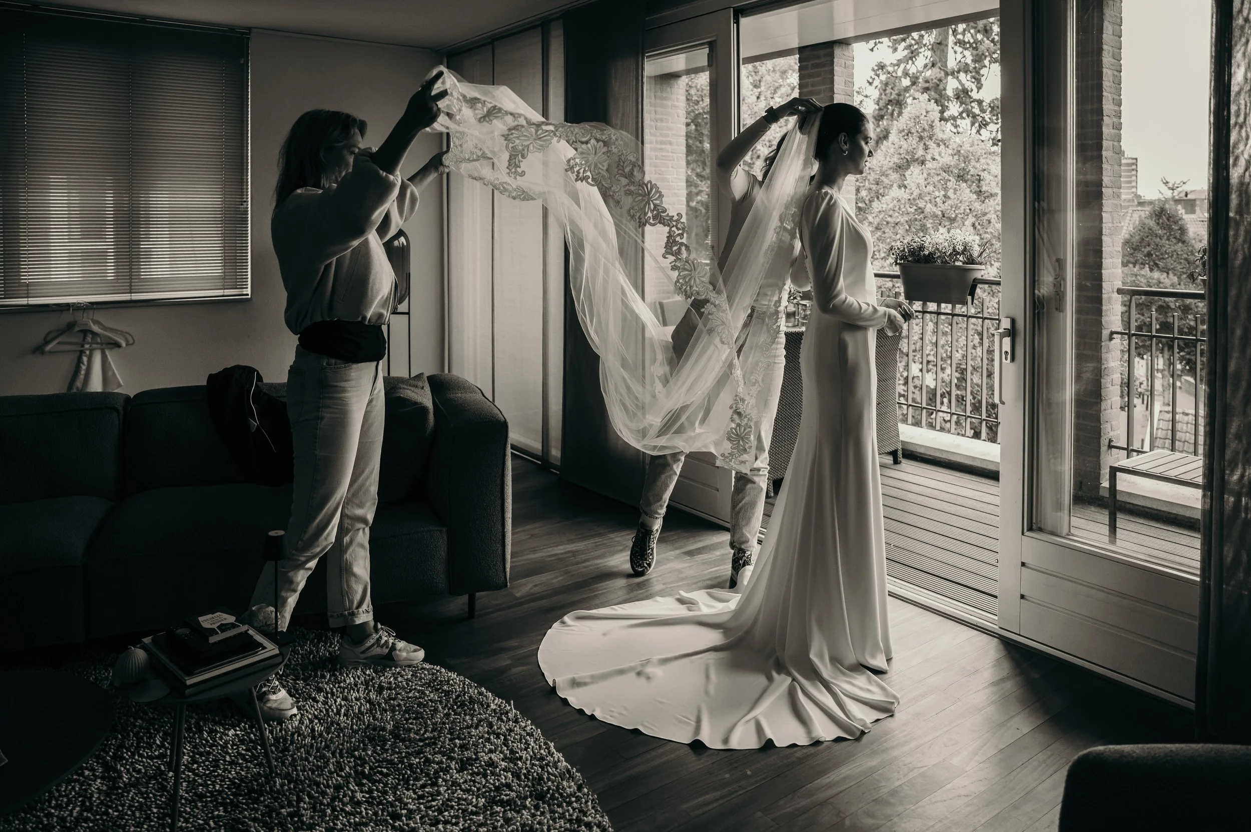 Natuurlijk duimen we voor een zonnige trouwdag, maar het Nederlandse weer kan verrassen. Regent het toch? Dan kijken we samen naar een passende binnenlocatie, zodat jullie foto’s alsnog zorgeloos gemaakt kunnen worden. Het is handig om hier vooraf al over na te denken om stress op de dag zelf te voorkomen.